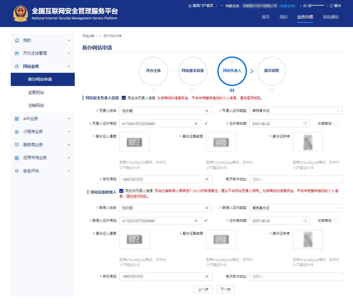 5、填寫網站負責人信息,建議一般同ICP備案所提交資料保持一致。